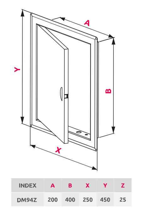 Metal access doors are available in four versions. Two of them - DM and DMN - are classic access doors with varying raw materials from which they were made (DM - door made of steel sheet, covered with epoxy coating in white or - for selected models - an antique colour; DMN - made of polished steel sheets in a chromonickel colour, giving them a noble look). All of them are equipped with elements facilitating installation and convenient for opening handles on door leafs.
